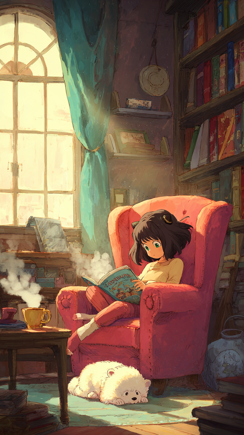 Image Title: Girl Reading Book in Cozy Armchair with Dog and Tea